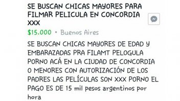 En otra publicación realizada el 16 de julio de este año, a las 10.22, en la misma página Compra Venta CONOCRDIA CHAJARÍ FEDERACIÓN, busca "chicas embarazadas y no embarazadas para filmar películas XXX". "Se filmará película XXX bajo contrato profesional en hotel de la ciudad todo legal bajo consentimiento de la chica presente con abogado y firmas responsables" por 15.000 pesos.