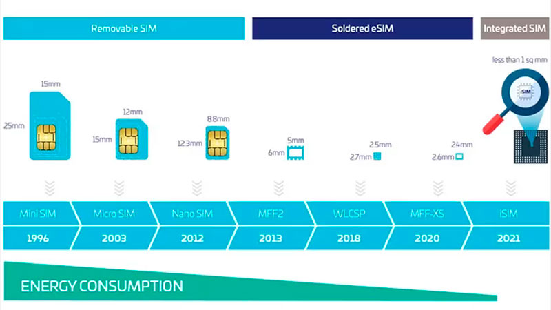 Ese rectángulo de plástico, con un chip metálico, ha ido cambiando con los años, haciéndose cada vez más pequeño. De la SIM a la miniSIM y la microSIM; la versión más chica es la nanoSIM, que casi no deja plástico alrededor de la chapita que se inserta dentro del teléfono. A esa versión le siguió la eSIM, la primera en venir integrada en el teléfono: es un chip, pero en vez de estar en una tarjeta, está soldado en el motherboard del teléfono; hay muchísimos dispositivos que hace años traen una eSIM y una ranura para la nanoSIM convencional.