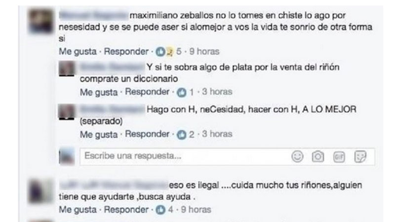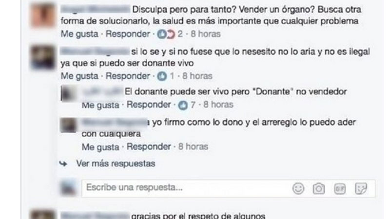 "Vendo un riñón no es chiste y con mucho respeto lo hago. Sé que hay gente que lo necesita y yo el dinero", escribió el hombre. Tras su mensaje se sucedieron decenas de comentarios, algunos con tono de crítica y chiste y otros como consejo, a lo que él respondió.
