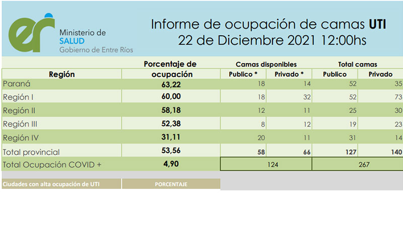 El Ministerio de Salud de Entre Ríos confirmó que la ocupación de camas de terapia intensiva está en un 53 por ciento. De ese total, solamente el 4,9 por ciento son pacientes de Covid-19.