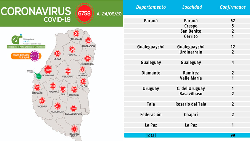 El ministerio de Salud de Entre Ríos a través de la Dirección de Epidemiología, dio a conocer el detalle del reporte <b>matutino de este jueves, en el que se informaron 99 casos de coronavirus en la provincia</b>.