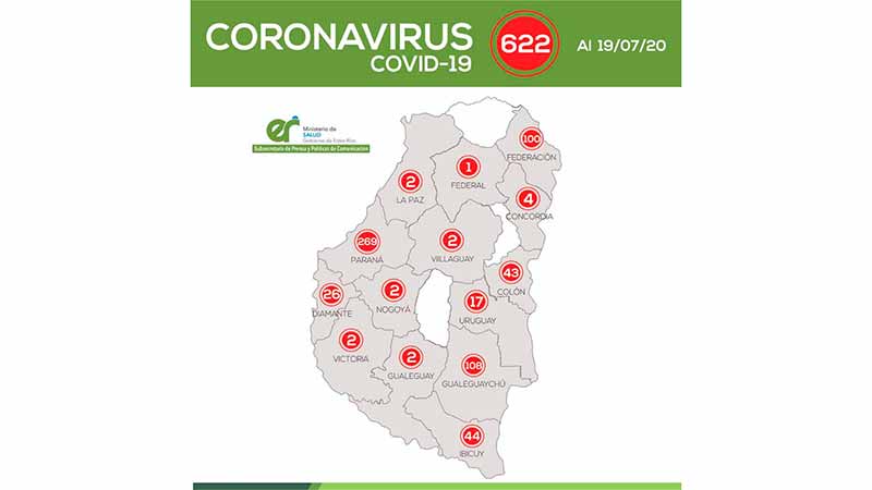 <b>Martes 14 de julio</b>: Se registraron 20 nuevos casos de coronavirus. Seis corresponden a la ciudad de Paraná, cinco son contactos estrechos y el restante su nexo epidemiológico se encuentra en investigación. Otros cinco casos son de la localidad de Gualeguaychú, y son contactos estrechos. Dos casos pertenecen al Departamento Diamante, uno de Colonia Ensayo y otro de la ciudad de Diamante, siendo ambos contactos estrechos. Cinco casos fueron confirmados en la ciudad de Concepción del Uruguay, cuatro son contactos estrechos y el restante, su nexo epidemiológico se encuentra en investigación. Un paciente fue confirmado en la ciudad de Concordia y su nexo epidemiológico se encuentra en estudio. Otro caso fue detectado en el Departamento Colón, en la localidad de Villa Elisa y es contacto estrecho de paciente con Covid-19.