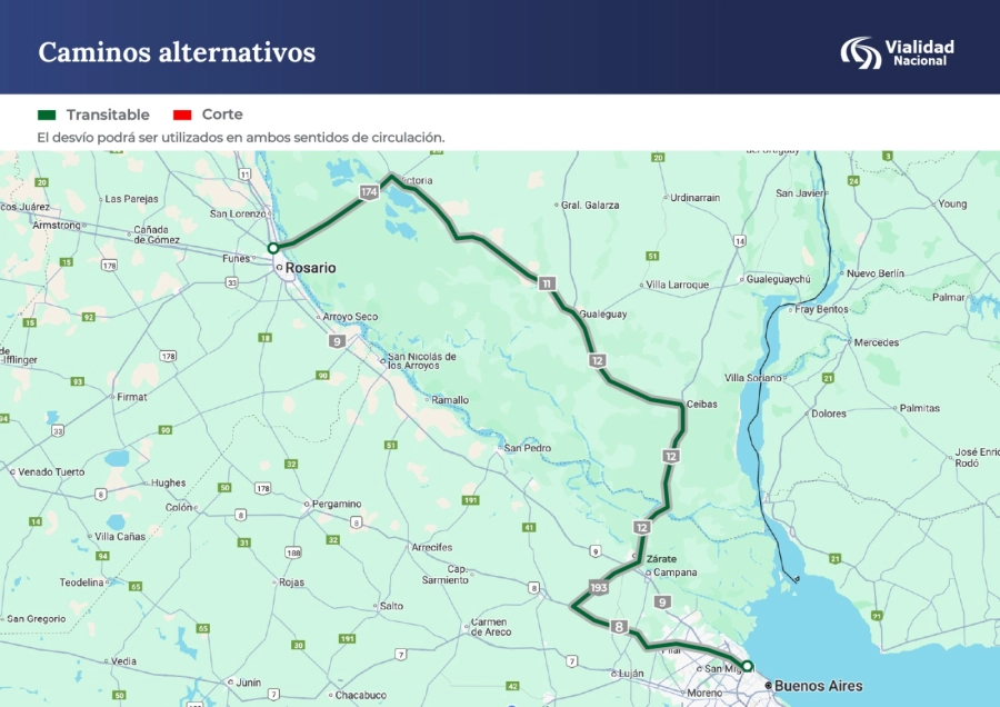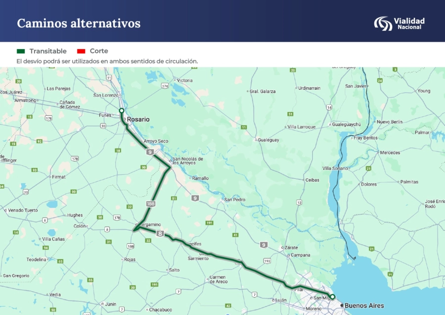 Vialidad Nacional informó este domingo las rutas alternativas disponibles para circular entre las provincias de Entre Ríos, Santa Fe y Buenos Aires, ante los anegamientos provocados por las recientes tormentas. El organismo nacional recomendó dos caminos alternativos, ante los cortes en sectores de las rutas nacionales 8 y 9.