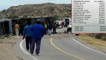 Autoridades mendocinas difundieron hoy la lista de las 15 personas fallecidas por el vuelco de un ómnibus cerca de la ciudad de San Rafael, entre las que se incluyen nueve menores de edad.