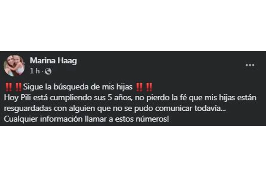 Marina Haag no habla con los medios de comunicación, pero decidió utilizar sus redes sociales para continuar con el pedido de búsqueda de sus dos hijas, Delfina, de 1 año, y Pilar, de 5, en un día especial.