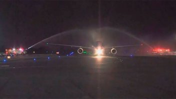 Al aterrizar en el aeropuerto Ministro Pistarini, dos camiones lanzaron grandes chorros de agua, formaron un arco y empaparon la aeronave. Se trata de una especial conmemoración que se realiza en el mundo aeronáutico.