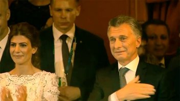Flanqueado por Awada, y por la canciller alemana Angela Merkel, el presidente escuchó desde el escenario "Argentina, Argentina" que coreaban los más de 80 artistas en escena.