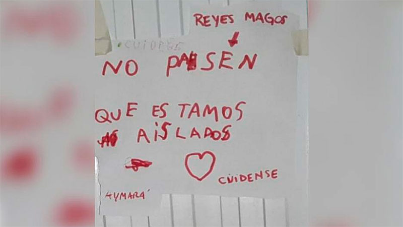 “Reyes Magos. No pasen que estamos aislados. Cuídense”, se leen en el escrito que dejó en su domicilio.