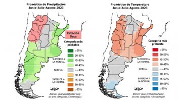 Mientras tanto se estima mayor probabilidad de ocurrencia de temperatura media superior a la normal sobre el Litoral (incluida Entre Ríos), este de Buenos Aires, región del NOA y Cuyo.