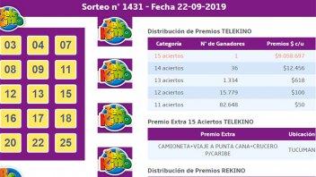 En tanto en la modalidad Requino, también un tucumano logró 15 aciertos y recibirá $ 394.636 c/u. Salieron el 01, 02, 04, 05, 06, 08, 09, 10, 11, 15, 16, 19, 20, 21 y 22.