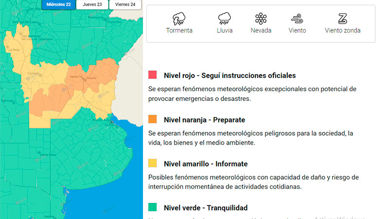 El Servicio Meteorológico Nacional elevó a media mañana de este miércoles a naranja el nivel de alerta para el centro y norte de Entre Ríos, junto al centro de Santa Fe y parte de Córdoba. En esta zona “se esperan fenómenos meteorológicos peligrosos para la sociedad, la vida, los bienes y el medio ambiente”, señaló el organismo al dar cuenta sobre las características del informe.