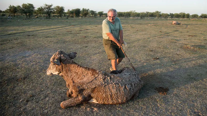 Gustavo Giailevra, de 62 años, productor ganadero, camina sin levantar la mirada para poder contener la emoción que le genera la escalofriante escena que ha dejado la falta de lluvias. Lo rodean los restos de al menos 60 de las 200 vacas que se le murieron en su campo ubicado en Pozo Borrado, en el departamento Nueve de Julio en esta provincia. En medio de lo que parece un cementerio de animales, hay un ejemplar que todavía agoniza.