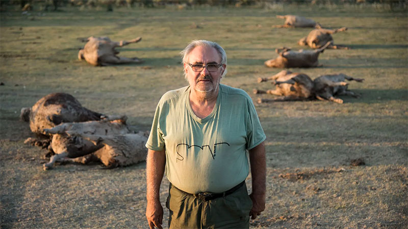 “Es la muerte anunciada porque de una sola aguada están tomando agua 1700 cabezas entre grandes y chicas. El problema es muy grave. Vinimos varias veces con las retroexcavadoras, pero ya no podemos ir más abajo porque se va a echar a perder el agua al infiltrarse agua salada”, explica. Al ver que hay una vaca que todavía está viva, la agarra de la cola y la trata de ayudar a levantarse; el animal se arrodilla, pero no tiene fuerzas para pararse y vuelve a desplomarse en el suelo.