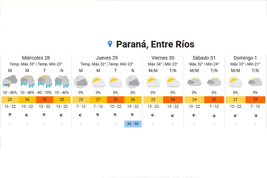 El pronóstico del tiempo para Paraná, elaborado por el Servicio Meteorológico Nacional, indica que durante los próximos días se mantendrán las altas temperaturas, con registros máximos que oscilarán entre los 32 y 34 grados, y la posibilidad de precipitaciones en la jornada de este miércoles.
