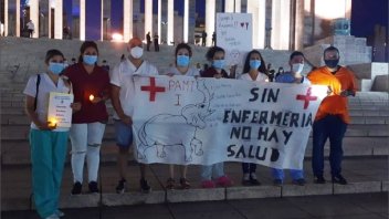 Este jueves por la noche los enfermeros y enfermeras de la provincia de Santa Fe realizaron una muy ordenada manifestación hasta el Monumento a la Bandera de Rosario, con el fin de visibilizar sus reclamos laborales y de recordar y reconocer a sus compañeros fallecidos durante la pandemia de coronavirus.
