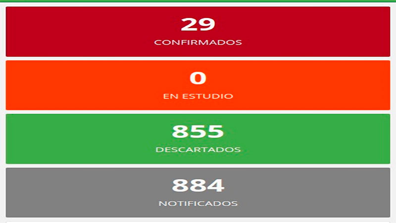 De ese modo, la provincia mantiene 29 casos confirmados, ningún caso en estudio, 855 descartados; en tanto que la cantidad de casos estudiados asciende a un total de 884.