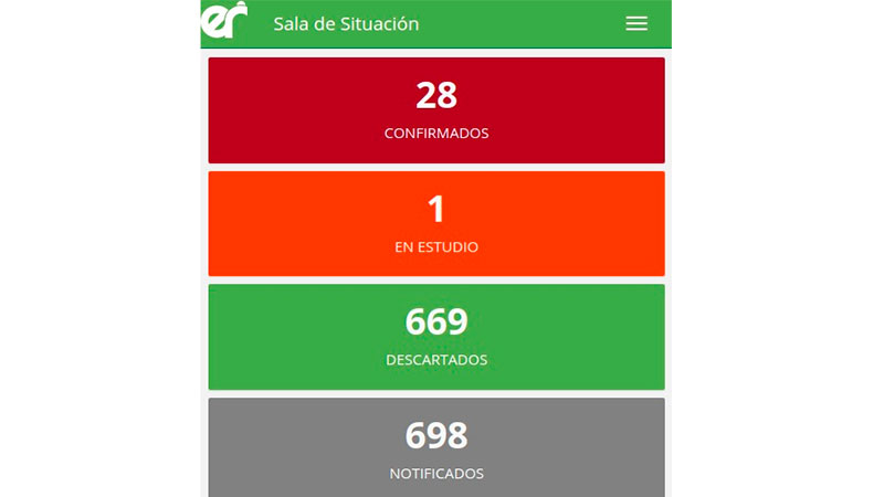 De ese modo, la provincia mantiene 28 casos confirmados; en tanto que aún hay un caso en estudio; y se han descartado 669 casos sospechosos. Finalmente, se indicó que la cantidad de casos estudiados asciende a un total de 698.