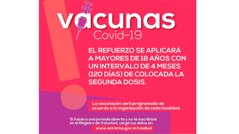 El Ministerio de Salud de Entre Ríos informó que, en los mayores de 18 años, el intervalo mínimo establecido para estar en condiciones de recibir la dosis de refuerzo se unifica a 4 meses (120 días) desde la fecha de aplicación de la última dosis que finalizó el esquema primario.