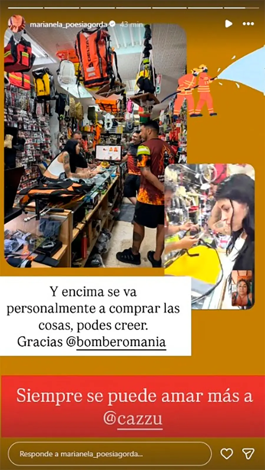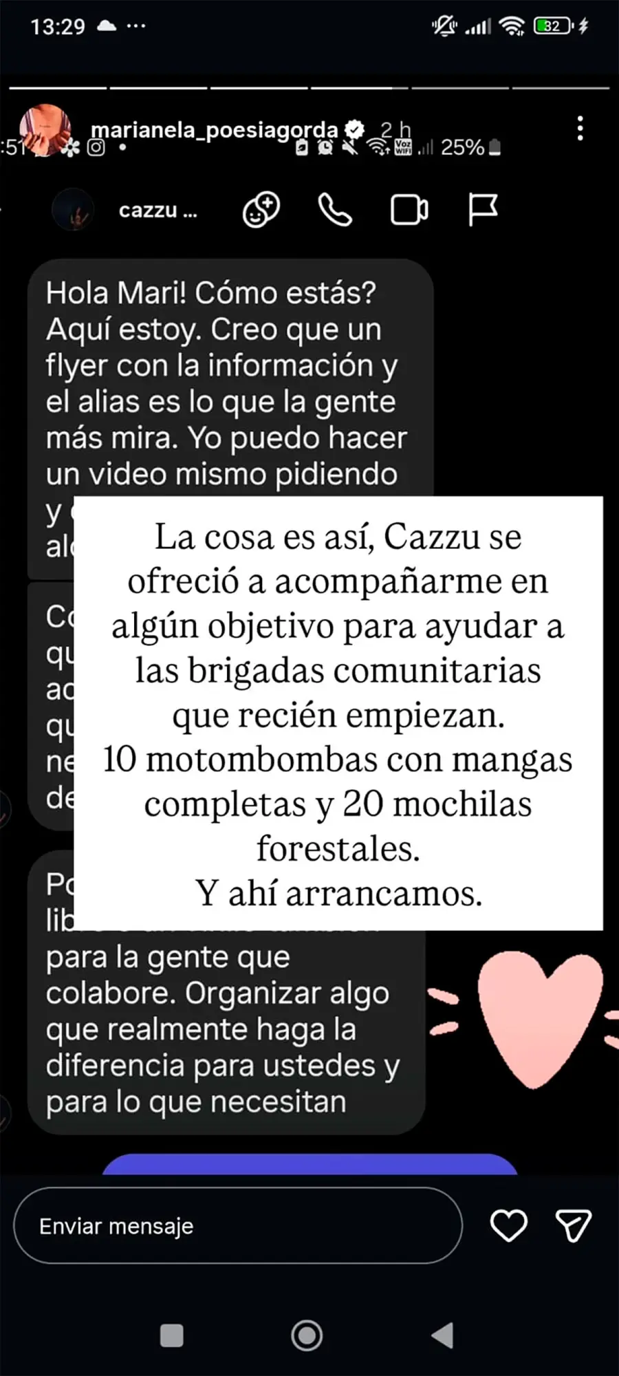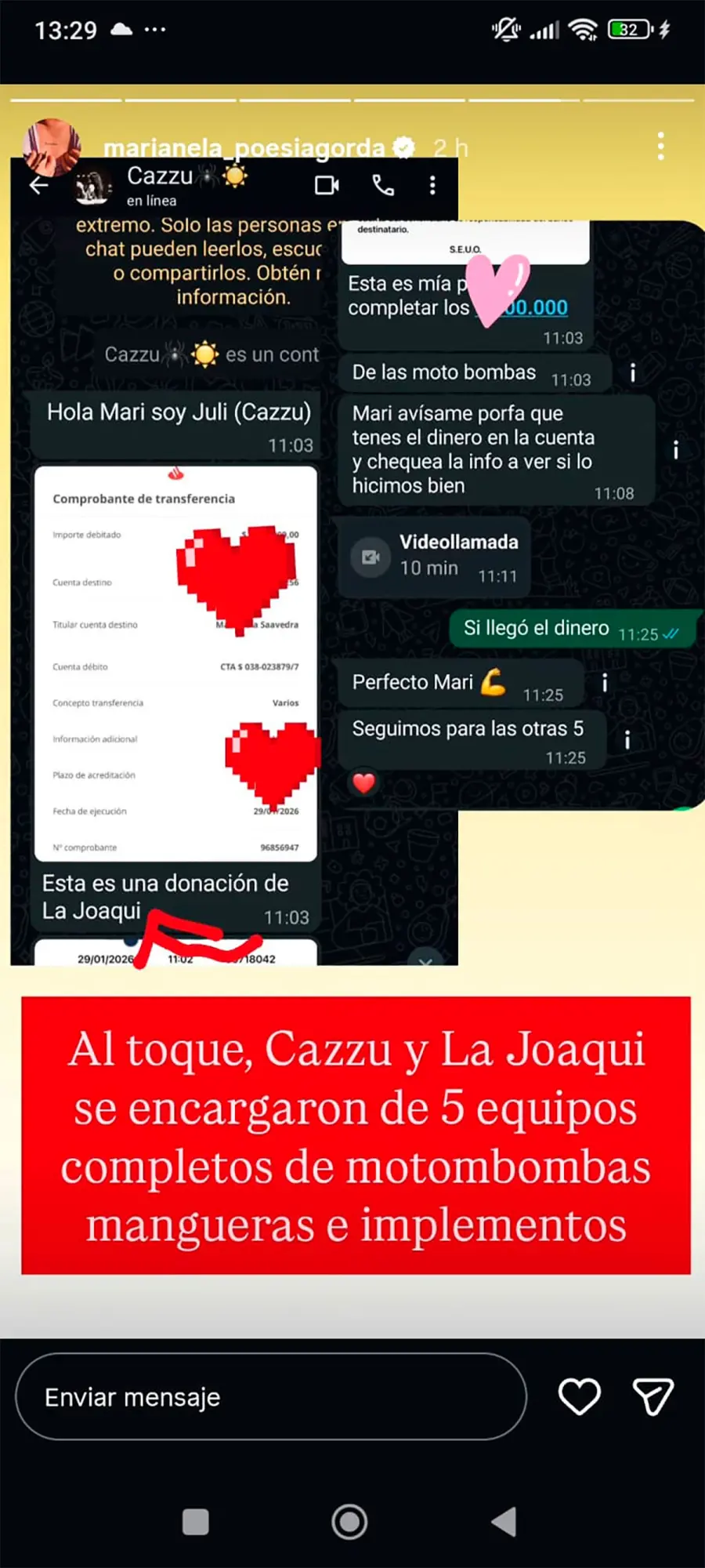 El objetivo de Marianela era claro: conseguir 10 motobombas y 30 mochilas de agua para asistir a brigadistas que arriesgan su vida en los incendios. La joven estuvo en la zona afectada, frente al fuego, y describió la experiencia con emoción. “Es muy duro para las personas que estamos acá”, confesó en un video que compartió en redes sociales, mostrando desesperación e impotencia ante la magnitud del desastre.