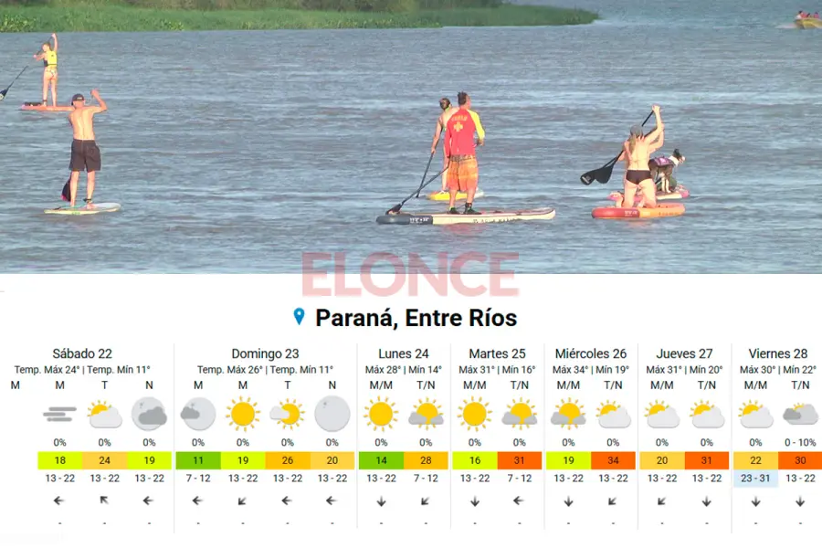 El incremento de las marcas térmicas será uno de los elementos más relevantes del período de pronóstico. Para lo que resta de la semana, el viento norte ya favorecerá máximas que superarán ampliamente los promedios de la época. Es más, para Paraná, se pronostican registros que, hacia el miércoles, prepararán a los 34ºC.