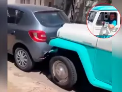 El hombre utilizó una Estanciera para empujar el automóvil y así liberar la entrada de su cochera. “Fíjate si coincide el paragolpes”, se escucha decir al hombre a bordo del modelo de producción nacional, tras lo cual le da marcha al rodado.