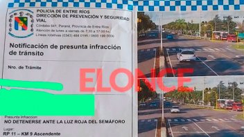 Elonce accedió a una notificación por una infracción en uno de los semáforos de Oro Verde. En el documento enviado por la Dirección de Prevención Vial se detallan los datos que involucran al vehículo infractor y el día que se cometió la falta. Además, ilustran el documento tres imágenes donde se observa el momento de la falta. “Esas imágenes sirven para constatar la infracción”, expresó Palacios.