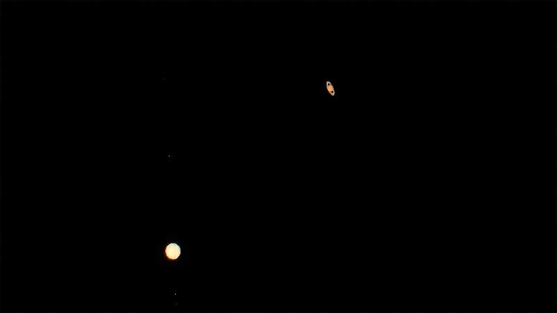 De acuerdo al experto, tras la puesta del Sol los dos gigantes gaseosos aparecen en el mismo campo de visión de un instrumento de observación, dando la impresión de que se rozan, aunque en realidad están separados por cientos de millones de kilómetros.