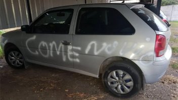 Los daños son cuantiosos ya que con aerosol blanco pintaron sobre un lateral del VolksWagen Gol la frase "come novio" y "p..." sobre el capot. Además, rayaron con un elemento que podría ser un destornillador el otro costado del vehículo.