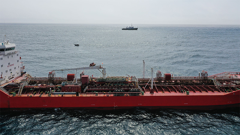 El voluminoso tanker flotante abastece de combustible a los pesqueros que depredan el Agujero Azul. Contiene 17 millones de litros de gasoil, y por la falta de legislación de las aguas internacionales, nadie controla su seguridad.