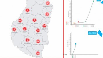 Le siguen en cuanto a la detección de casos los Departamentos Islas de Ibicuy con 42 y Colón, con 30. No obstante, el primero mencionado, hoy no reportó nuevos enfermos y el segundo, parece haber controlado la propagación hace un par de días.