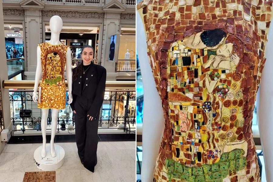 Además, incorporó una intervención artística al diseño: “Tiene El Beso de (Gustav) Klimt pintado sobre las cáscaras de naranja”, detalló. Según contó, el vestido no está pensado para el uso cotidiano, sino como obra de arte efímera. “La idea es que solo sea para la exposición y que en cierto tiempo se degrade, para no contaminar. Es todo natural”, afirmó.