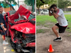 Ignacio junto al auto con el que se accidentó y recuperándose