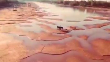 Habitantes de la zona aprovecharon el fenómeno para cruzar el río a caballo y realizaron imágenes con un drone. <b>Con las tomas aéreas retrataron la llamativa escena que muestra a dos personas a caballo que recorren lo que podría ser una duna de arena o un desierto</b>.