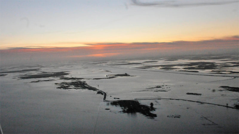 Con el paso de la crecida del río Salado por la zona baja de la cuenca (Pila, Lezama, Chascomús, Castelli) siguen las complicaciones tanto para el tránsito como para las poblaciones chicas y los puestos rurales. Un corte casi total de la ruta 57 cerca de la localidad de Pila hace que esa población esté a punto de quedar aislada. El vuelo de un drone muestra la emergencia que se vive en ese distrito bonaerense.