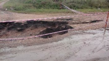 Las imágenes corresponden a la Ruta 28 a la altura de Federal; puede observarse cómo se ha erosionado la parte media de la ruta, y si bien existe una cinta de advertencia, recomiendan circulan con precaución.