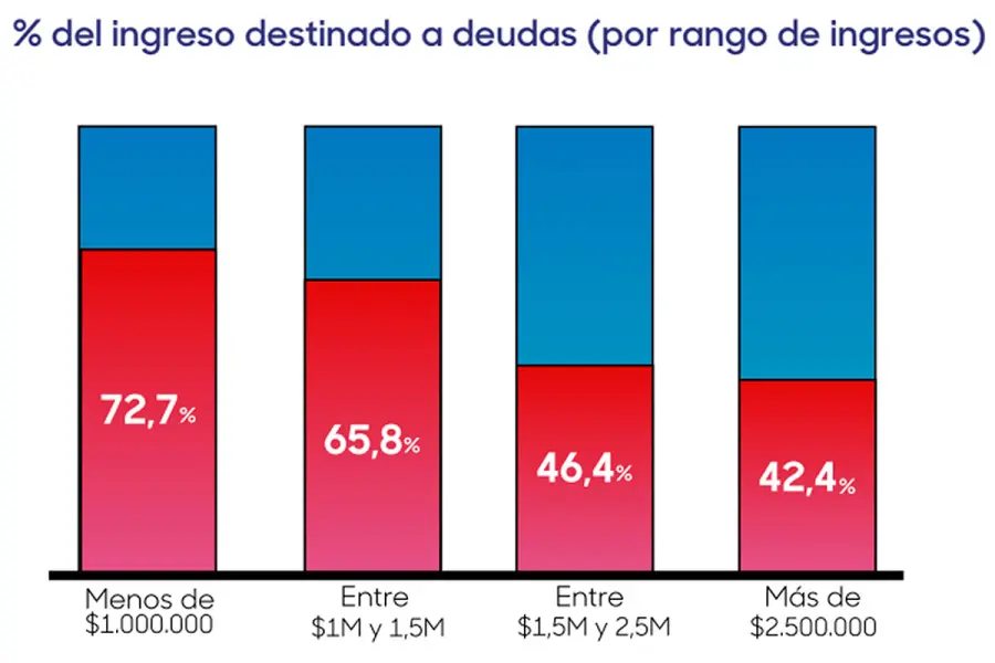 El estudio también evidenció que la situación se agrava en los sectores de menores ingresos. “Los que dijeron cobrar menos de 1 millón de pesos destinaron hasta un 72,7% de su ingreso a pagar deudas”, detalló Bernardi. Este dato refleja una desigualdad estructural donde quienes menos ganan son los más afectados por el sobreendeudamiento.