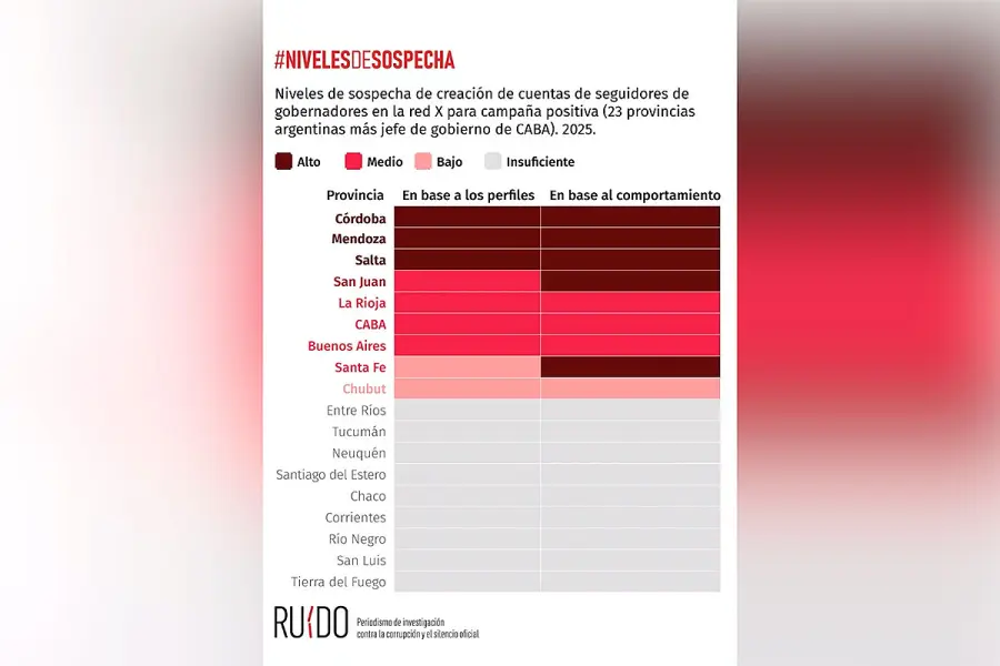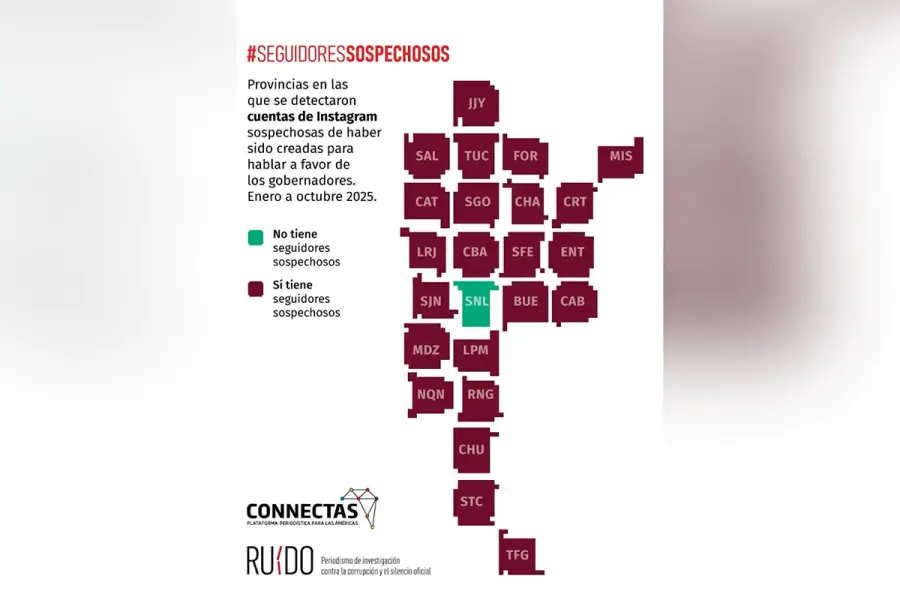 Trolls positivos en redes de gobernadores. Una investigación periodística sobre seguidores falsos realizada por la red nacional de periodistas y comunicadores Ruido mostró que en 23 de los 24 distritos de Argentina se detectaron perfiles sospechosos en redes sociales, Instagram y X. “Solamente se dedicaban a elogiar a los gobernadores. Sin biografía, sin imagen de perfil o una genérica”, explicó Edgardo Litvinoff, periodista y director editorial.
