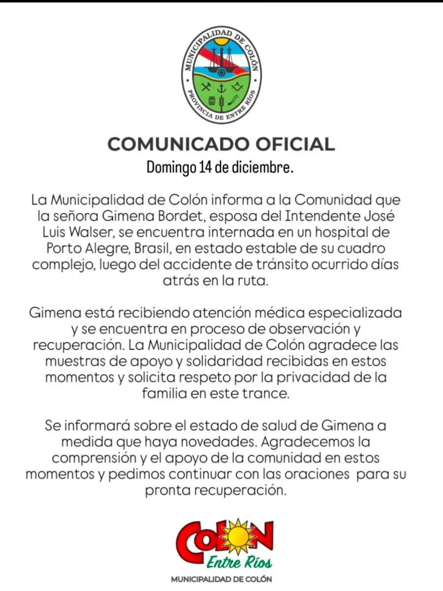La Municipalidad de Colón informó este domingo que Gimena Bordet, esposa del intendente José Luis Walser, permanece internada en un hospital de la ciudad de Porto Alegre, Brasil, donde recibe atención médica especializada tras el accidente de tránsito ocurrido días atrás en una ruta del vecino país. Según el comunicado oficial, su estado de salud es estable dentro de un cuadro considerado complejo.