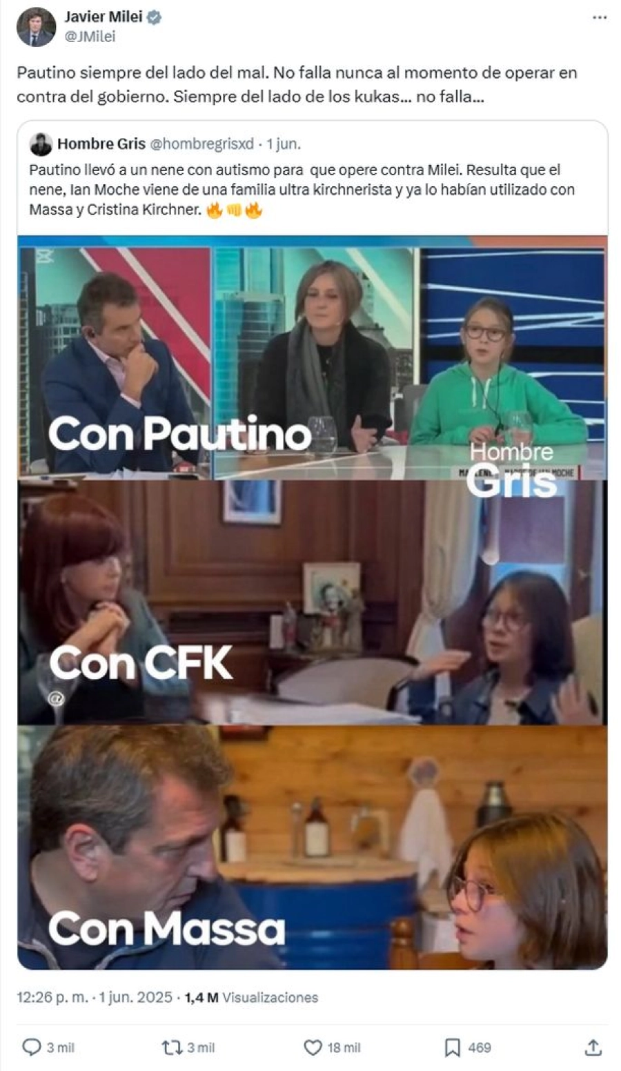 El juez federal de La Plata, Alberto Recondo, había señalado en su primera resolución que Milei “puede no hablar en el ejercicio de sus responsabilidades oficiales, sino hablar con su propia voz”, al compartir un mensaje en X que incluía imágenes de Ian junto a Cristina Kirchner y Sergio Massa. En ese fallo, el magistrado sostuvo que no se trató de un ataque a la honra y reputación del menor.