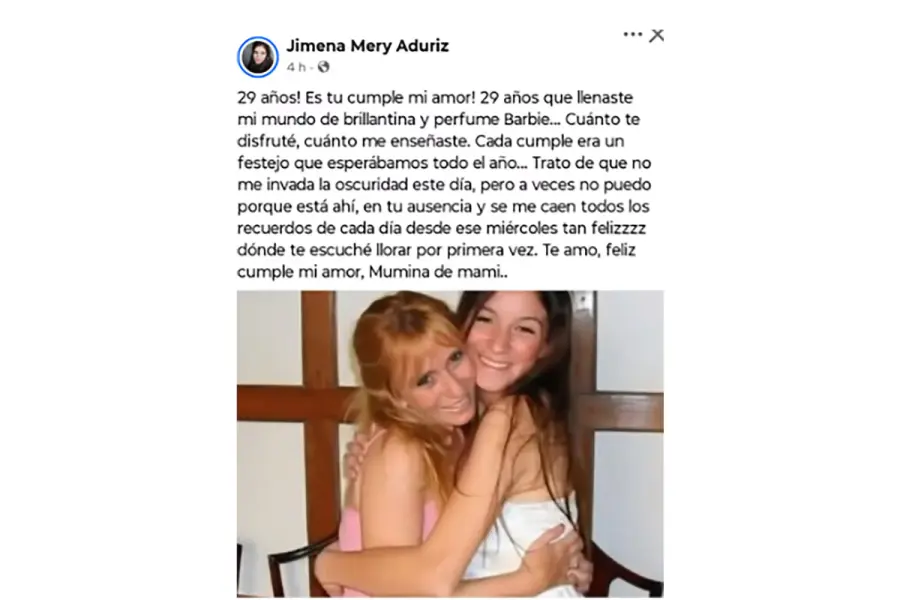 “29 años que llenaste mi mundo de brillantina y perfume Barbie... Cuánto te disfruté, cuánto me enseñaste. Cada cumple era un festejo que esperábamos todo el año...”, se lee en el mensaje que acumuló decenas de comentarios y ‘me gusta’.