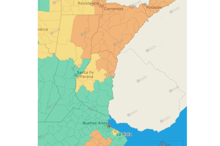 La alerta amarilla incluye a los departamentos Paraná, Diamante, La Paz, Nogoyá y Villaguay, mientras que la naranja a Concordia, Federación, Federal, Feliciano y San Salvador.