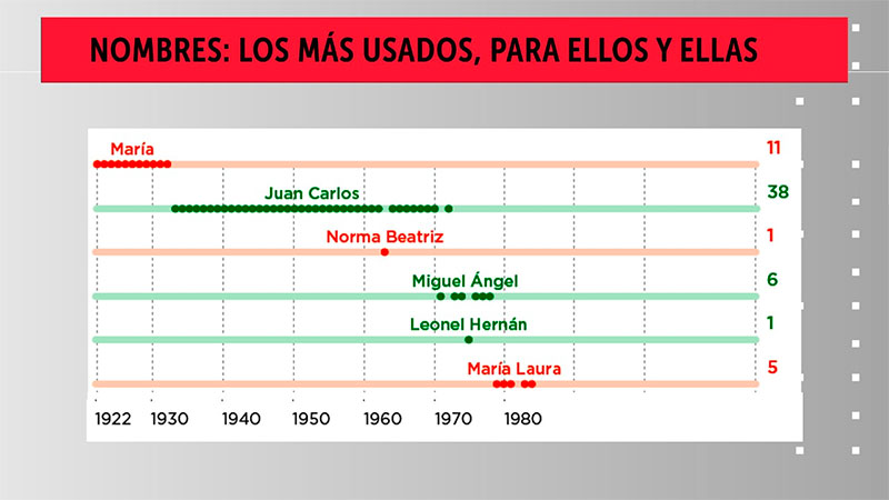 Por ejemplo, 1978 fue el año de las "Marías". Los diez nombres femeninos más elegidos fueron, en orden: María Laura, María Eugenia, María Soledad, María de los Ángeles, María Fernanda, María José, María Alejandra, María Cecilia, María Florencia y María Belén.