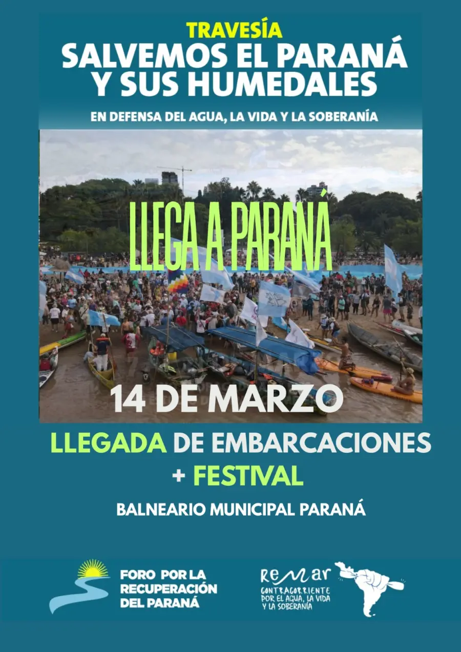 La travesía “Salvemos el Paraná y sus Humedales”, una remada y movilización en defensa del río Paraná y los humedales, arribará este sábado 14 de marzo desde las 16 en el Balneario Municipal de la capital entrerriana. Se trata de una iniciativa impulsada por diferentes colectivos sociales que recorren el río con el objetivo de visibilizar la defensa del ecosistema y cuestionar proyectos vinculados al dragado de la vía navegable.