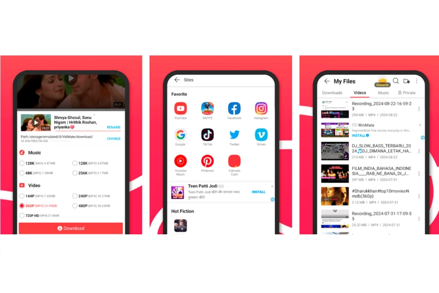 VidMate combina la descarga de videos con una experiencia multimedia más completa. Permite descargar en alta calidad—hasta 4K si está disponible—y ofrece múltiples opciones de resolución.