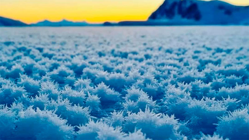 El especialista dijo que “esto ocurre en las placas de hielo, cuando el agua superficial del mar se congela y lo hace expulsando la sal marina, lo que crea un exceso de sal en el agua de mar circundante o en la propia base porosa de hielo. A este exceso, se le conoce como salmuera. En las fisuras del hielo formado se escapa vapor de agua, que con la sublimación se transforma en hielo sin pasar por el estado líquido, utilizando como superficie de congelación la sal presente en el hielo”, agregó.
