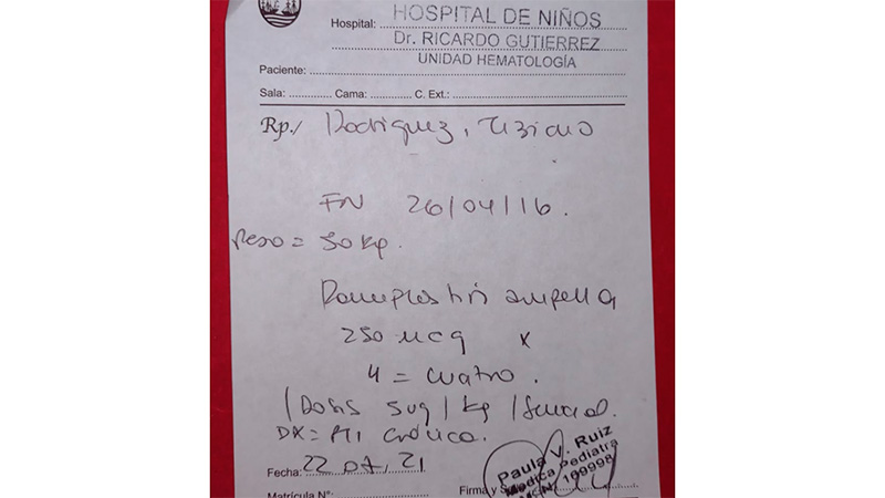 El niño, de cinco años y cuatro meses, permanece internado en el Hospital de Niños Ricardo Gutiérrez. Fue derivado desde el Hospital San Roque de Paraná. “Cuando llegamos, hace dos meses, él pasó la primera semana internado, luego está unos días internados y otros, en donde concurrimos para que le hagan los estudios. Ahora se lo interna seguido por el tema de las plaquetas, ya que le pasan Gama. Su organismo no toleró el corticoide, por lo que se complica su tratamiento”, mencionó.