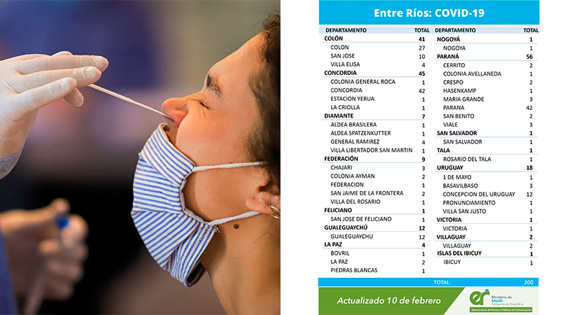 El área de Vigilancia Epidemiológica del Ministerio de Salud, confirmó que en Entre Ríos este miércoles se registraron 200 nuevos casos de coronavirus. Fueron 15 los departamentos que sumaron positivos y el de Paraná, fue el que más pacientes reportó por la pandémica enfermedad.