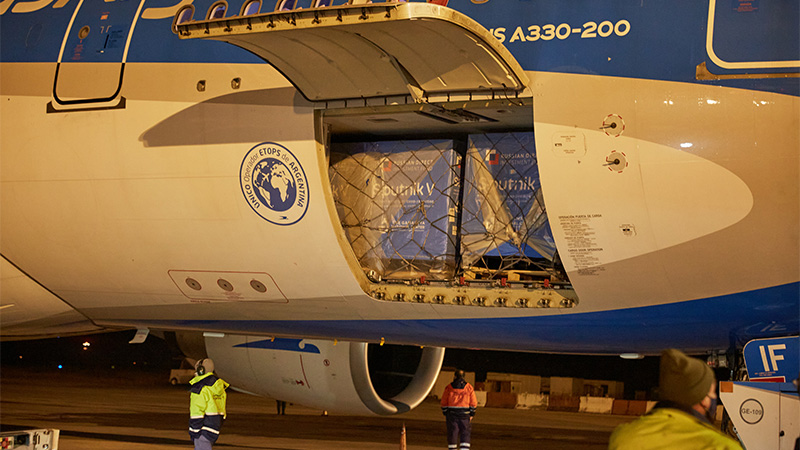 El vuelo AR 1603 proveniente del aeropuerto moscovita de Shemeretyevo es la 28va. operación que realiza Aerolíneas Argentinas para trasladar al país cargamentos producidos por el Centro Nacional de Investigación de Epidemiología y Microbiología Gamaleya.