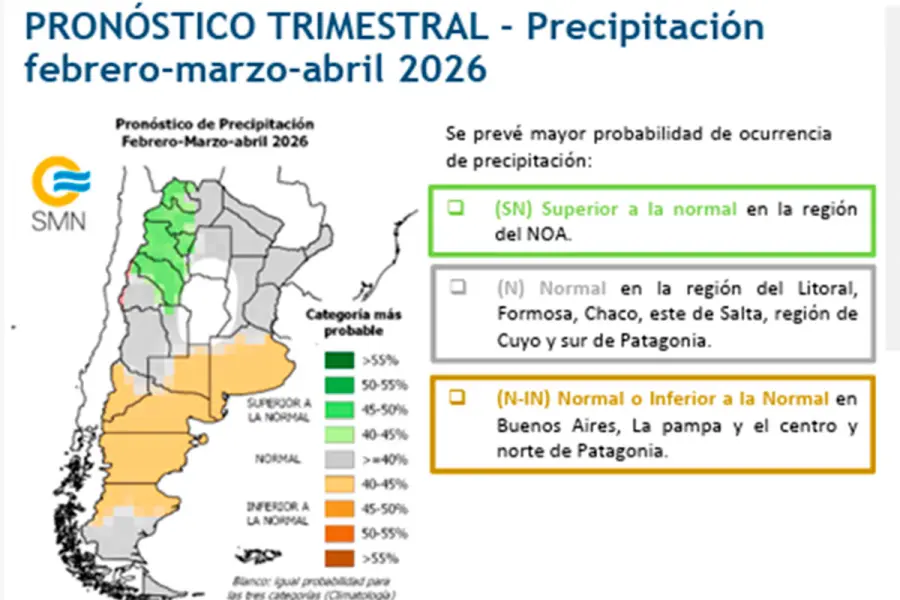 De esta forma, se anuncia mayor probabilidad de ocurrencia de lluvias normales en la región del Litoral, Formosa, Chaco, este de Salta, región de Cuyo y sur de Patagonia.