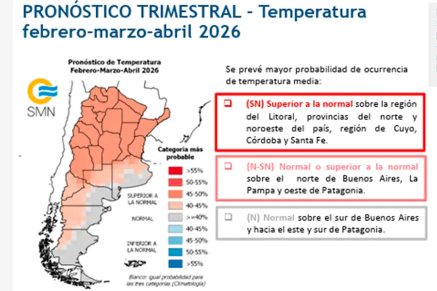 El informe al que tuvo acceso Elonce se indica que "el pronóstico de consenso para febrero-marzo-abril", en cuanto a temperaturas estima mayor probabilidad de ocurrencia de temperaturas medias superiores a lo normal en la región del Litoral, provincias del norte y noroeste del país, región de Cuyo, Córdoba y Santa Fe. Normales o superiores a las normales sobre el norte de Buenos Aires, La Pampa y oeste de Patagonia.